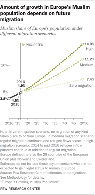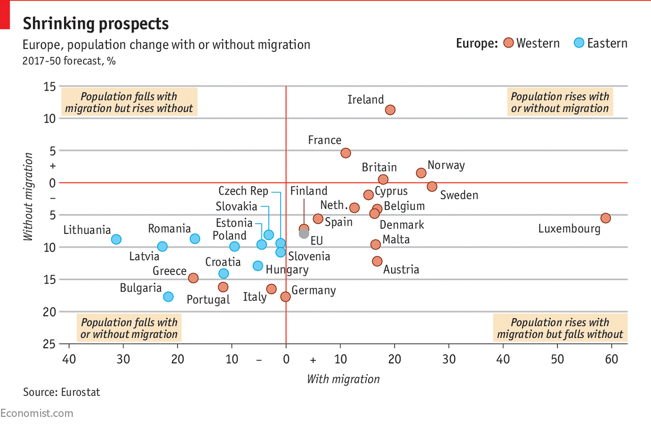 التنبؤ الإحصائي لما بين سنتي 2017-2050 يرسم صورة التحدّي الديمغرافي وعلاقته باستقبال الهجرات. فرنسة هي البلد الأوربي المهم الوحيد (إضافة إلى إيرلندا) الذي يتوقّع أن تشهد تزايداً سكانياً بغضّ النظر عن استقدام الهجرات. الوضع الإنكليزي هو صُفريّ النمو من غير هجرات. ألمانية سوف تعاني من تناقصٍ حادٍّ في السكان لولا تقبّل الهجرات، والهجرات تضعها على الحدّ الصفري حيث ليس هناك نمو سكاني ولا تناقص. إسبانيا ينمو عدد سكانها مع الهجرات وإلا تناقص. إيطاليا و بولندة يتناقص عدد سكانهما سواءً استقبلتا مهاجرين أم لا. كل دول أوربة الشرقية تعاني تناقصاً في السكان، بعضها بشكل حادٍ منذر، وكلاً من اليونان والبرتغال تعانيان من تناقصٍ غير محمود. أما روسية التي ما زال النمو فيها ضئيلاً جداً، عدد السكان مرشّحٌ للتناقص حتى عام 2050. وزيادة على هذا، المسلمون في روسيا ‑وهم سكان أصليون يشكلون حوالي 15% من السكان‑ هم الأعلى تكاثراً.