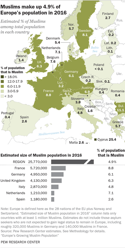 خريطة: نسب المسلمين الأوربيين مخطط: تقديرات متعددة لنمو عدد المسلمين الأوربيين